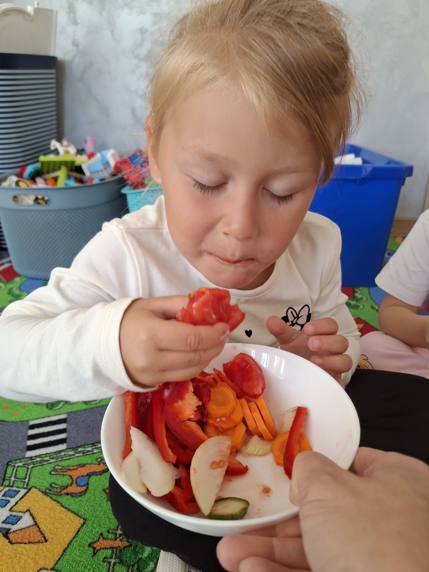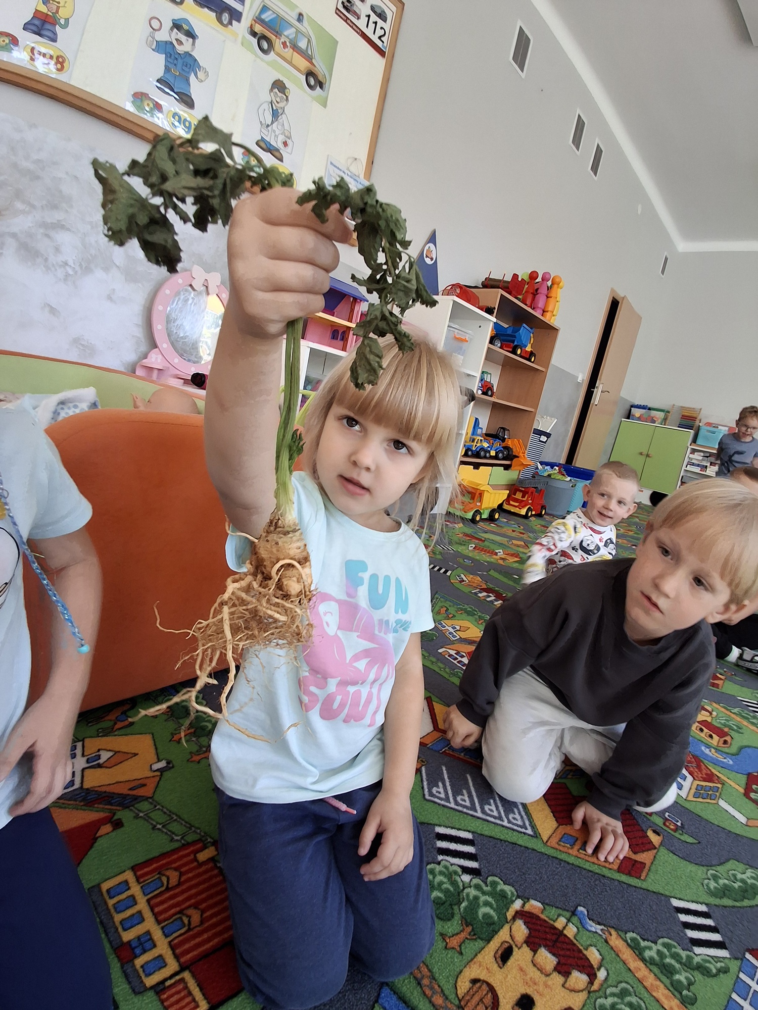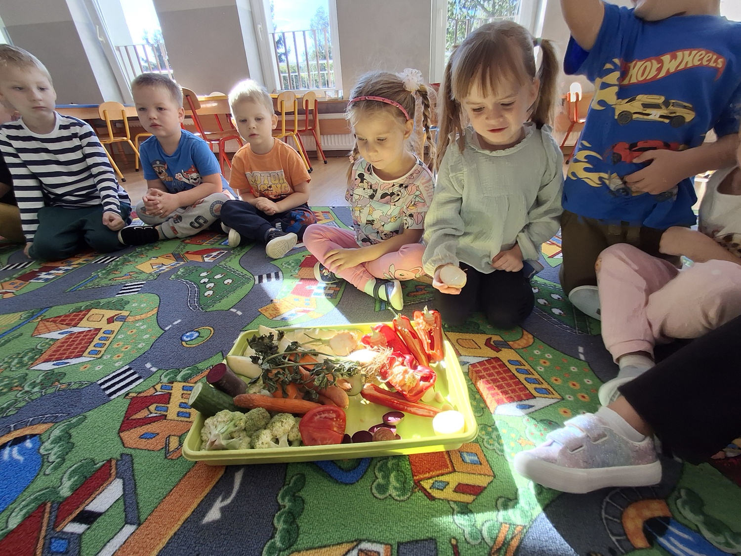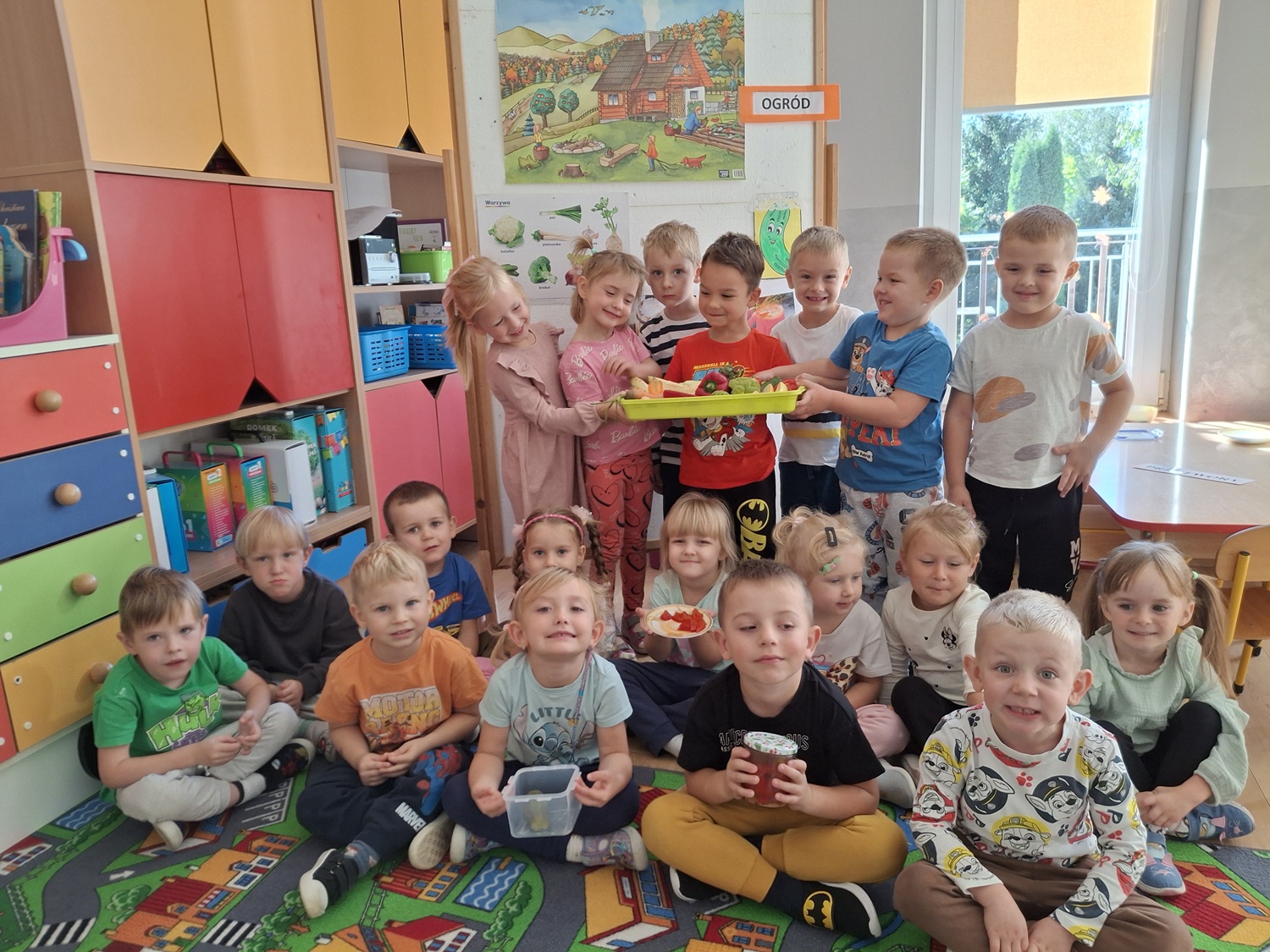 Owoce i warzywa towarzyszyły nam podczas codziennych zajęć w przedszkolu. Odbyło się wiele zabaw ruchowych i matematycznych. Puchatki poznawały miejsca gdzie rosną i gdzie można kupić te dary jesieni. Wykonały prace plastyczne wykorzystując farby i plastelinę, układały puzzle i rytmy. Smakowały i wąchały. Dowiedziały się również jak powstają przetwory, podawały swoje ulubione, a na koniec wykonały swój kompot owocowy. Po obiedzie wysłuchały ,,Rzepkę" Juliana Tuwima.