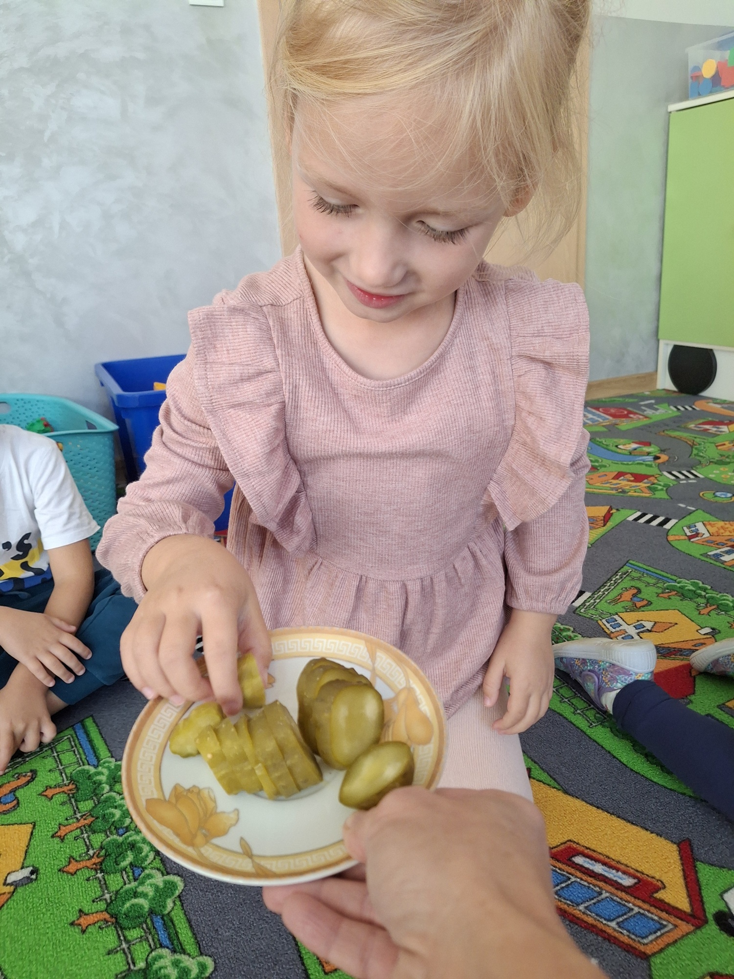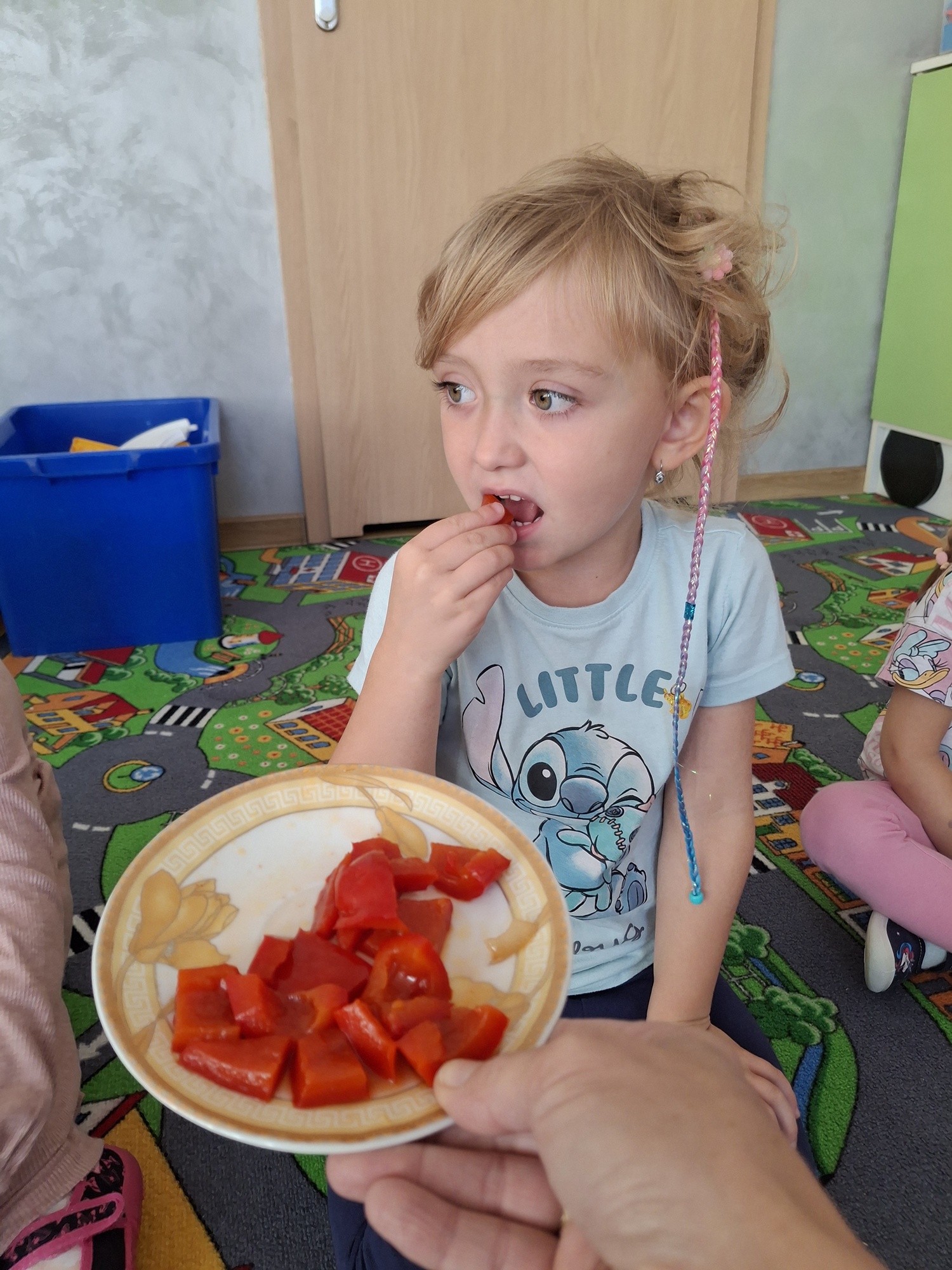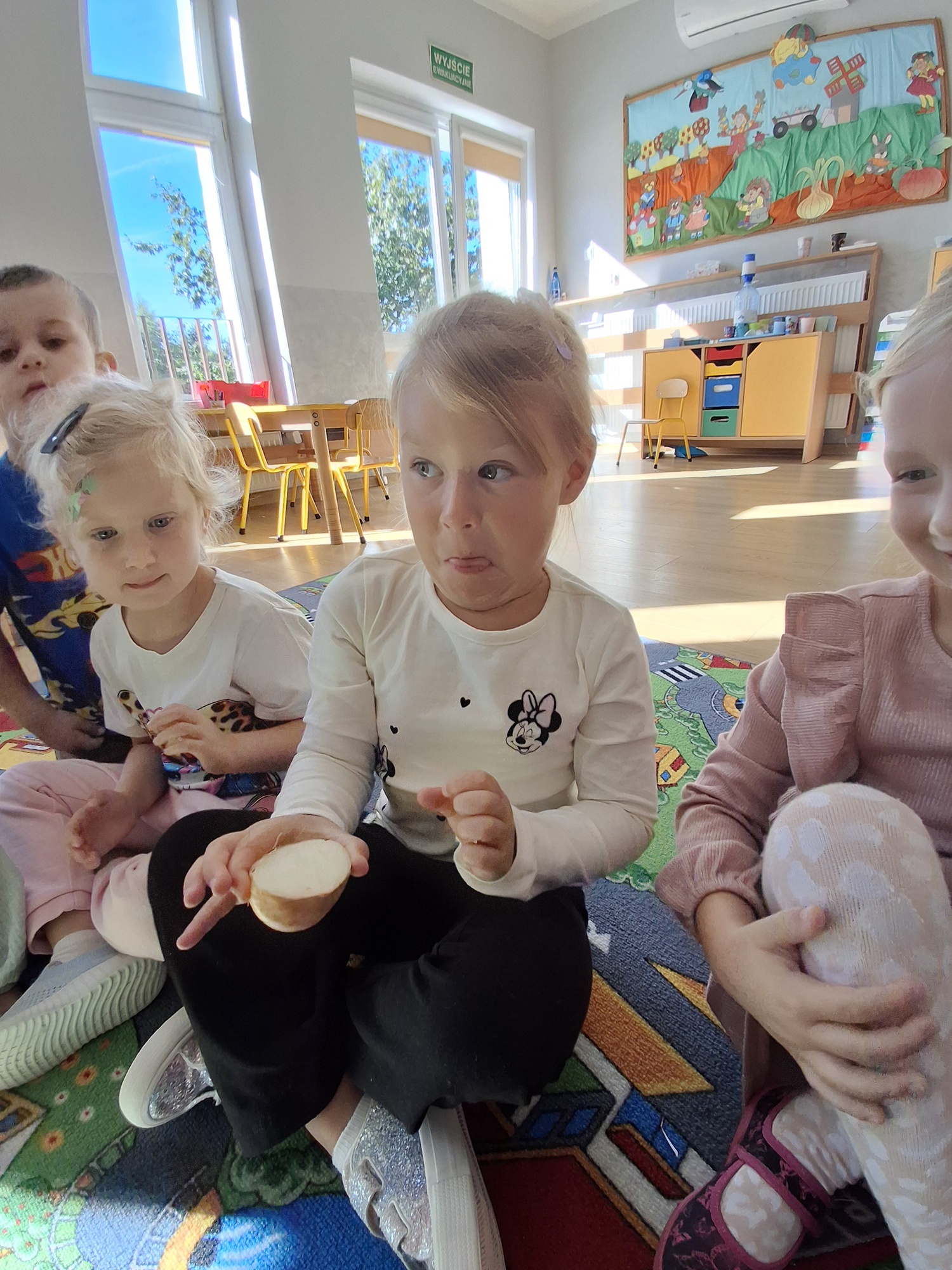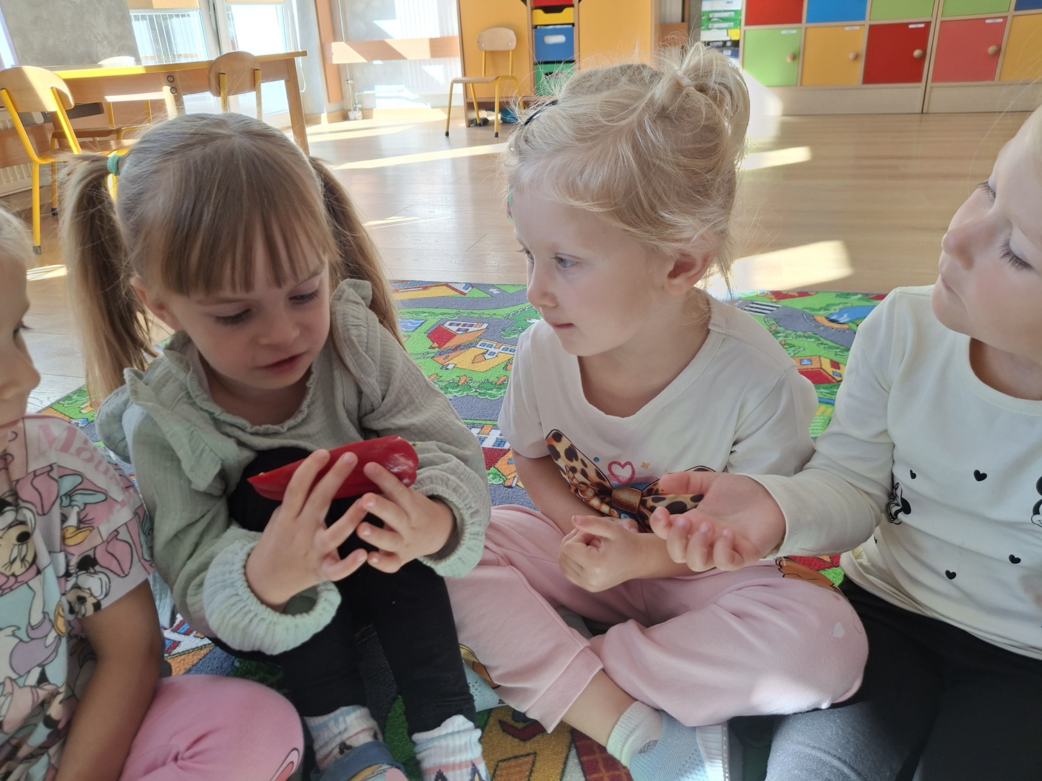 Owoce i warzywa towarzyszyły nam podczas codziennych zajęć w przedszkolu. Odbyło się wiele zabaw ruchowych i matematycznych. Puchatki poznawały miejsca gdzie rosną i gdzie można kupić te dary jesieni. Wykonały prace plastyczne wykorzystując farby i plastelinę, układały puzzle i rytmy. Smakowały i wąchały. Dowiedziały się również jak powstają przetwory, podawały swoje ulubione, a na koniec wykonały swój kompot owocowy. Po obiedzie wysłuchały ,,Rzepkę" Juliana Tuwima.