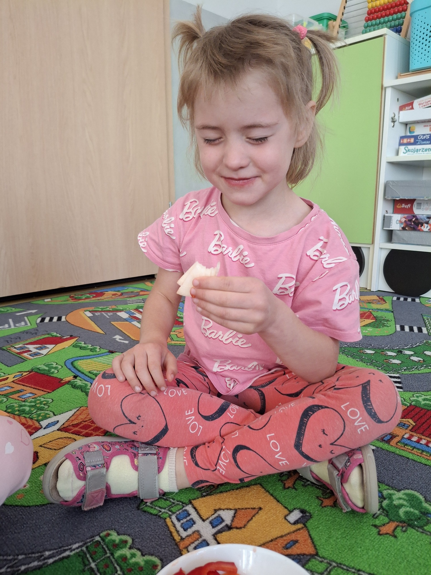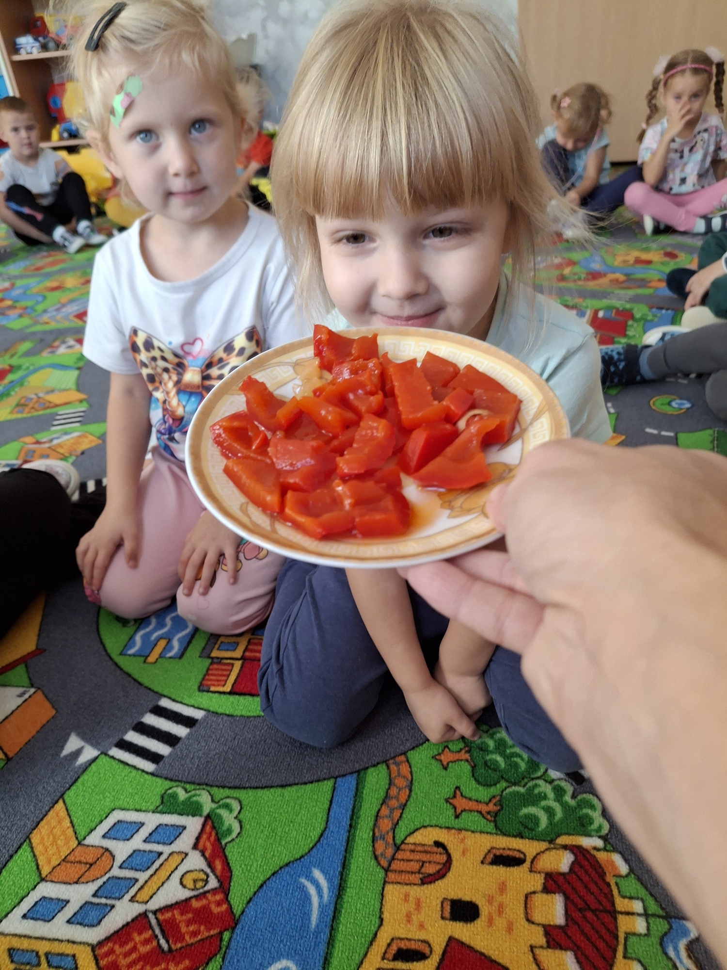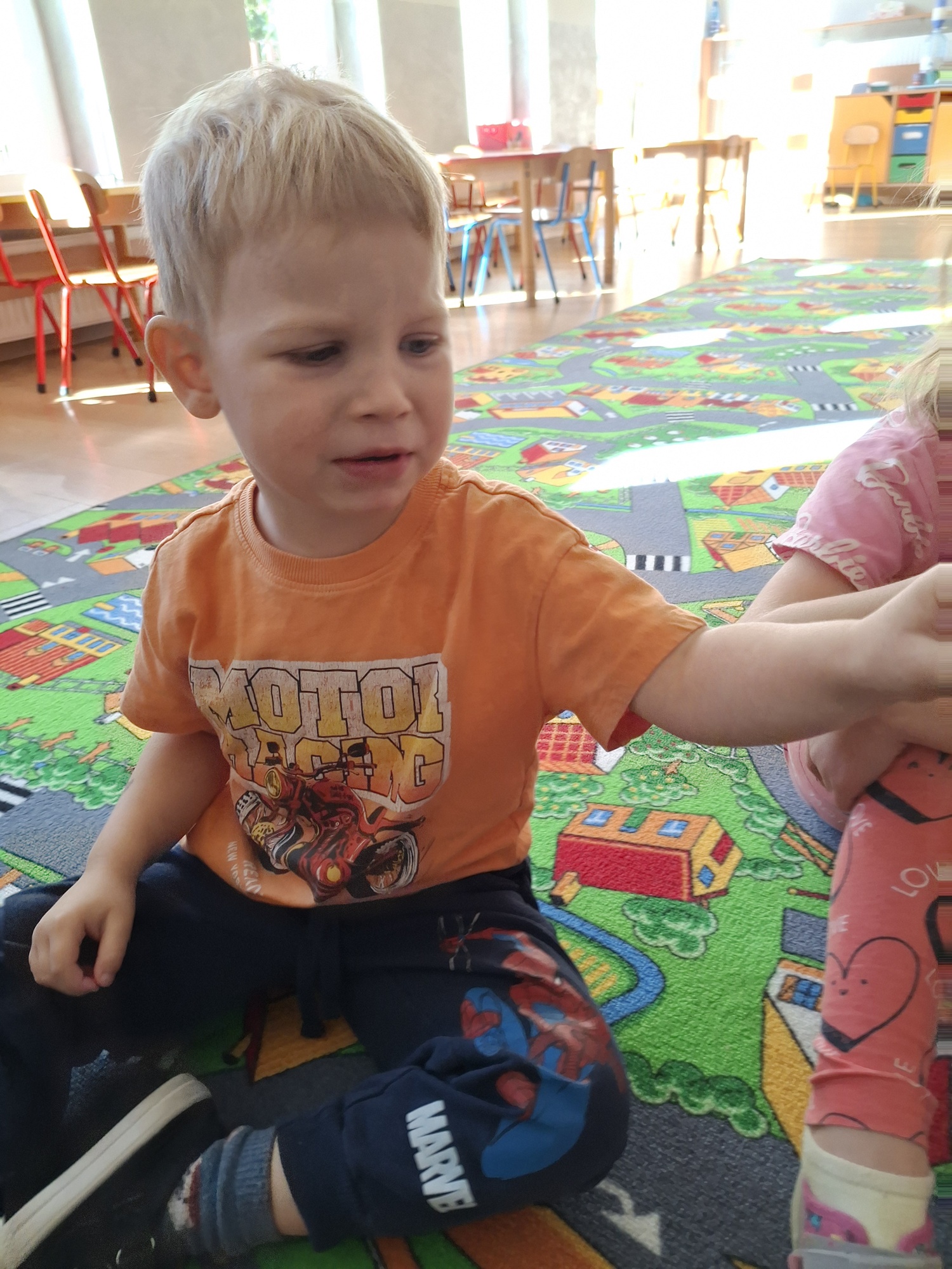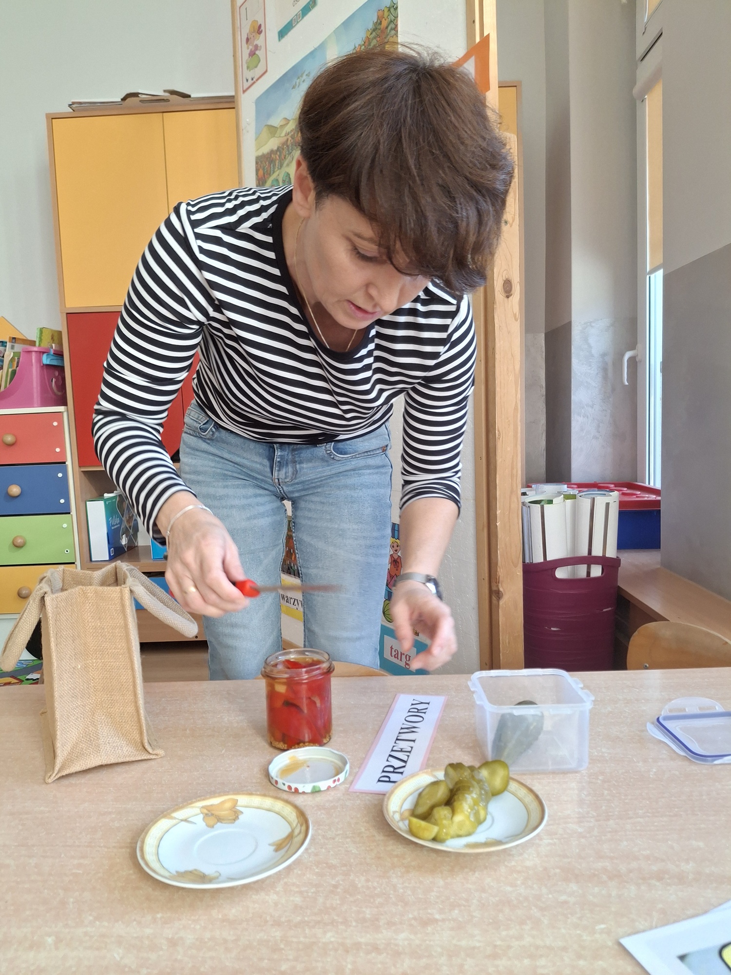 Owoce i warzywa towarzyszyły nam podczas codziennych zajęć w przedszkolu. Odbyło się wiele zabaw ruchowych i matematycznych. Puchatki poznawały miejsca gdzie rosną i gdzie można kupić te dary jesieni. Wykonały prace plastyczne wykorzystując farby i plastelinę, układały puzzle i rytmy. Smakowały i wąchały. Dowiedziały się również jak powstają przetwory, podawały swoje ulubione, a na koniec wykonały swój kompot owocowy. Po obiedzie wysłuchały ,,Rzepkę" Juliana Tuwima.