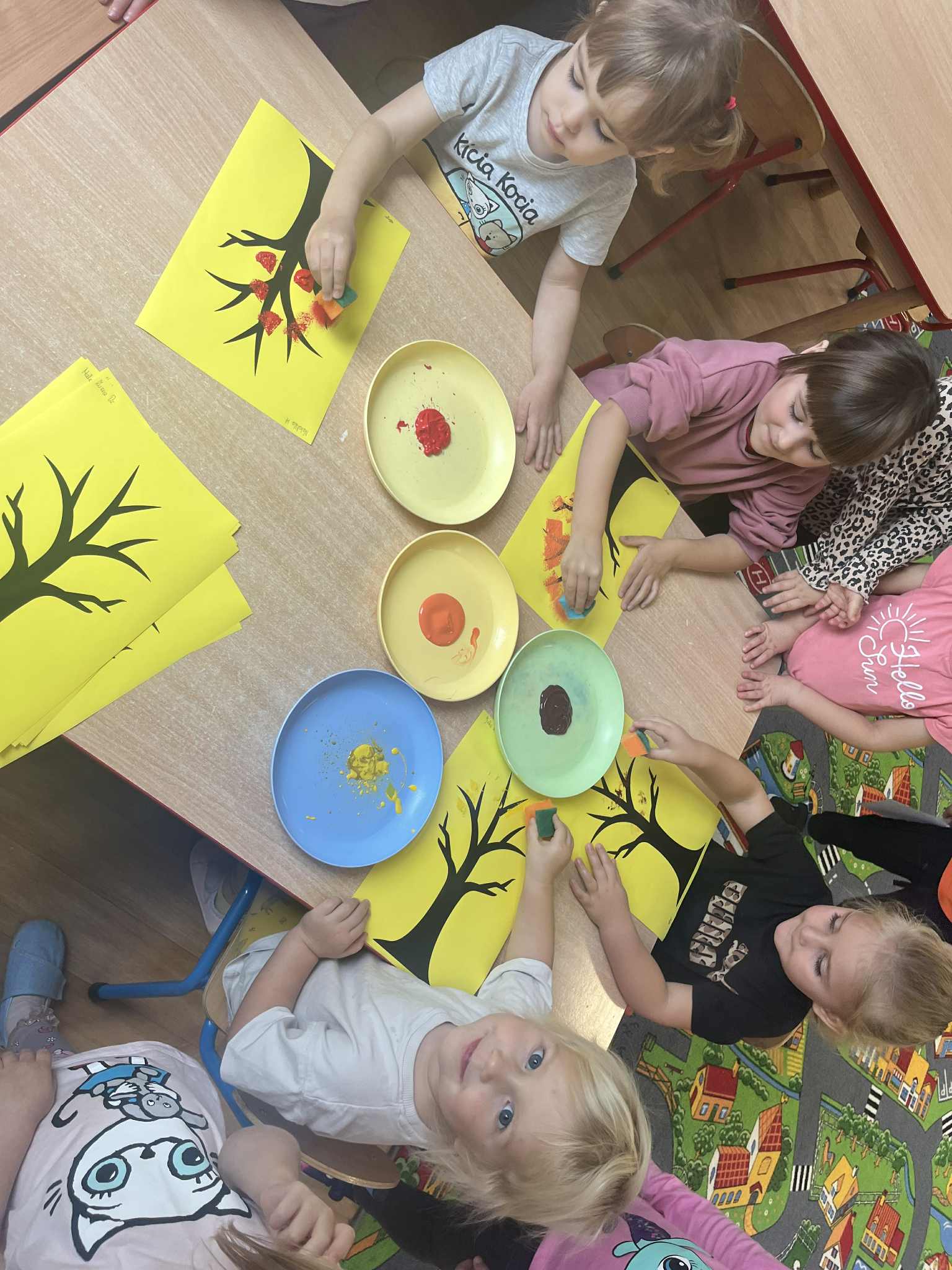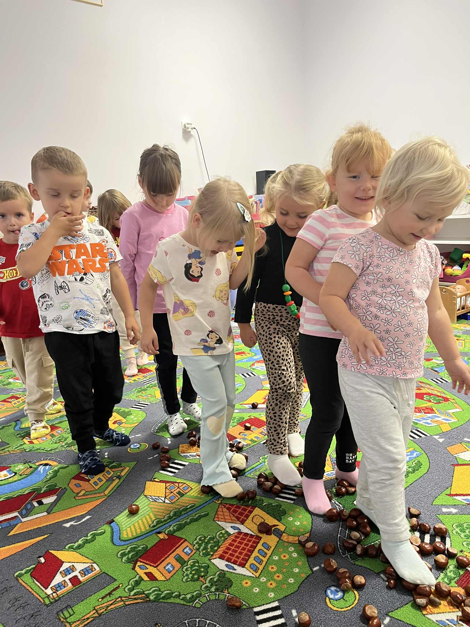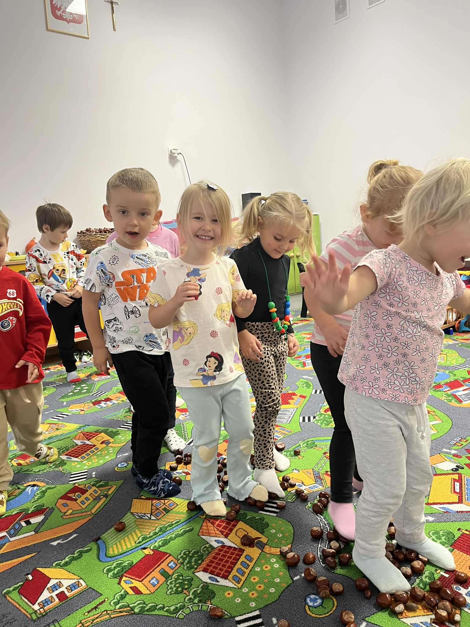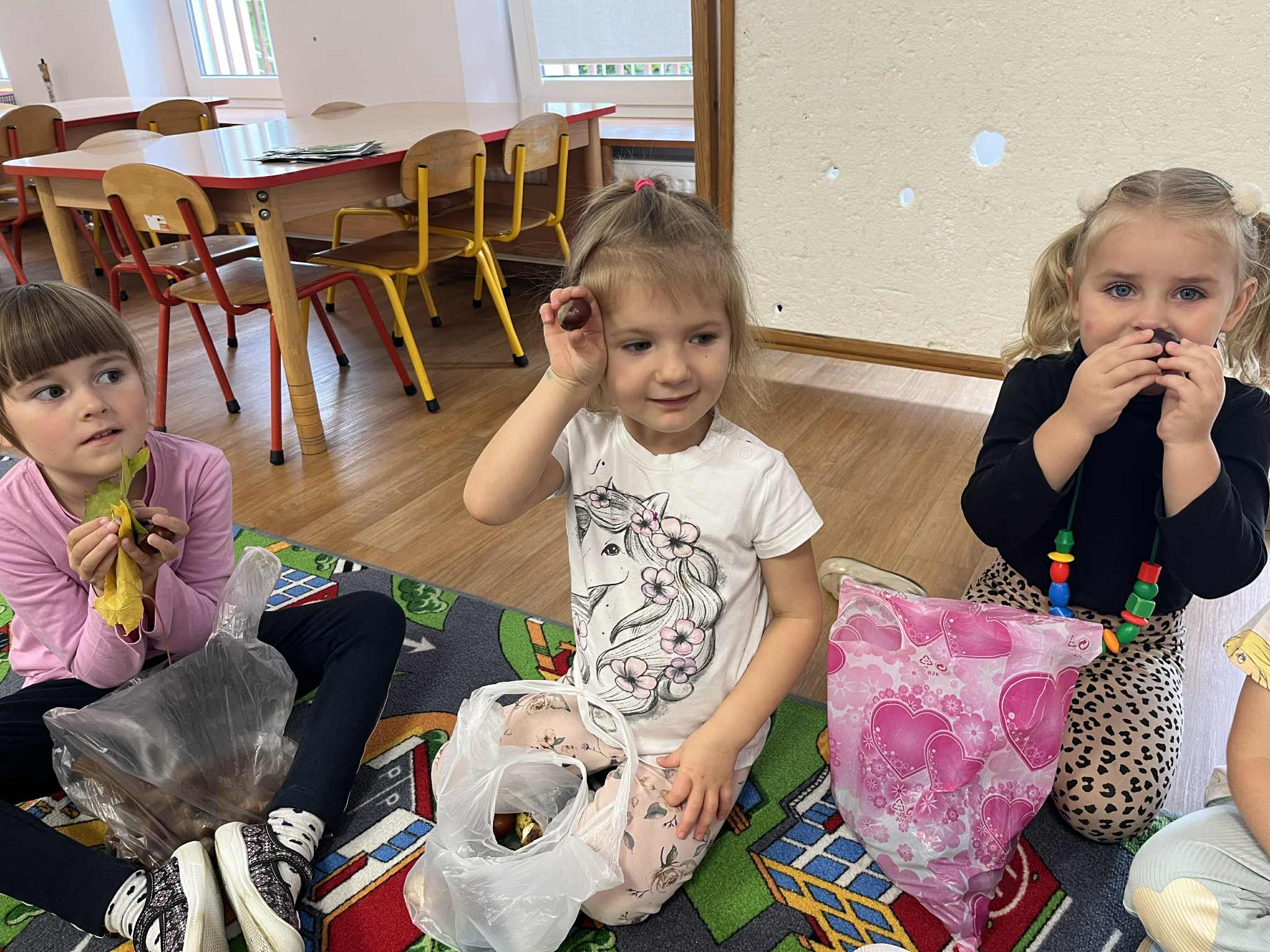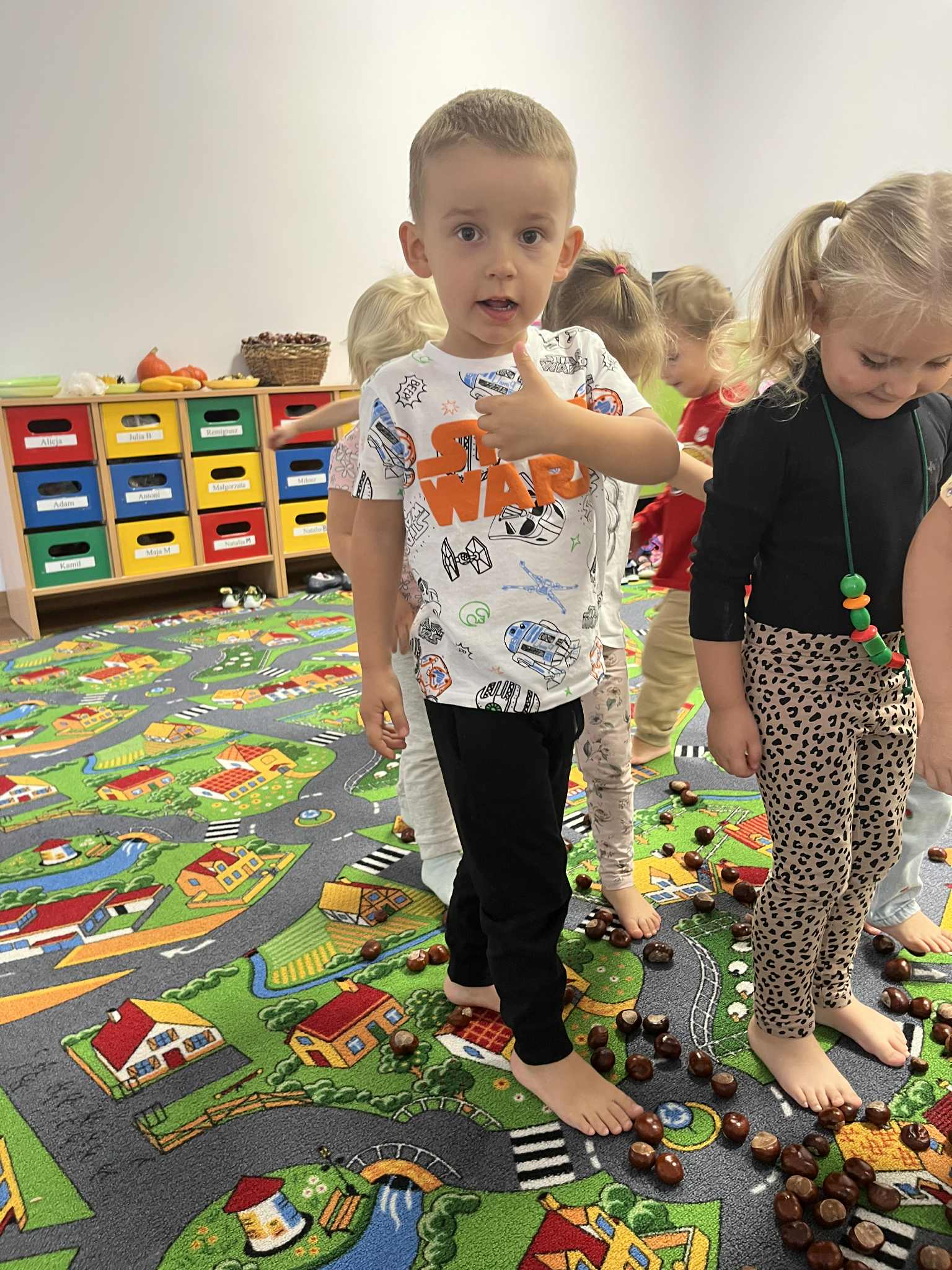 Miniony tydzień w naszym przedszkolu upłynął pod znakiem Złotej Jesieni. Dzieci z wielkim zaangażowaniem przynosiły z domów kasztany, żołędzie i inne skarby natury, które wspólnie wykorzystaliśmy do stworzenia jesiennej drogi sensorycznej. Chodziliśmy po niej w skarpetkach, a najodważniejsi – nawet boso! To była świetna okazja do rozwijania zmysłu dotyku i świetnej zabawy. Podczas zajęć rozmawialiśmy o drzewach i ich owocach, poznając takie gatunki jak: jarzębina, dąb, kasztanowiec oraz ich charakterystyczne owoce – żołędzie, kasztany czy korale jarzębiny. Wybraliśmy się również na spacer, podczas którego podziwialiśmy barwy jesiennych drzew. Udało nam się nawet znaleźć maślaki, które z radością zabraliśmy do przedszkola i wspólnie obejrzeliśmy z bliska. W piątek obchodziliśmy Dzień Drzewa. Z tej okazji dzieci stworzyły piękne, kolorowe prace plastyczne – każde drzewo było inne, wyjątkowe, tak jak nasi mali artyści.