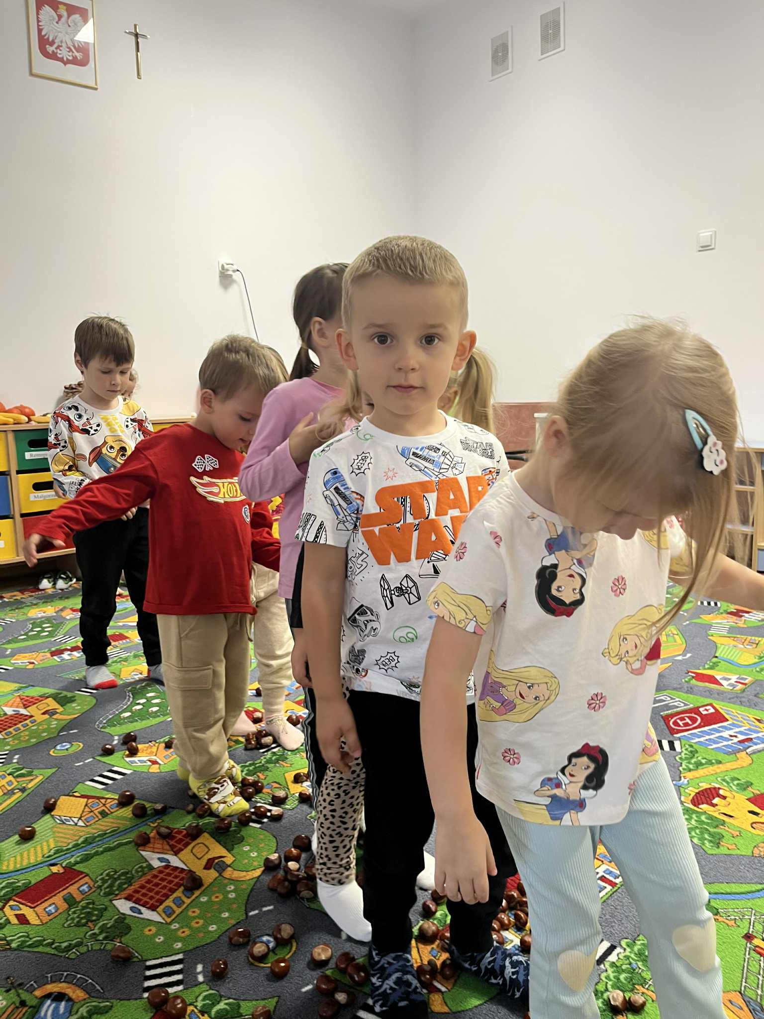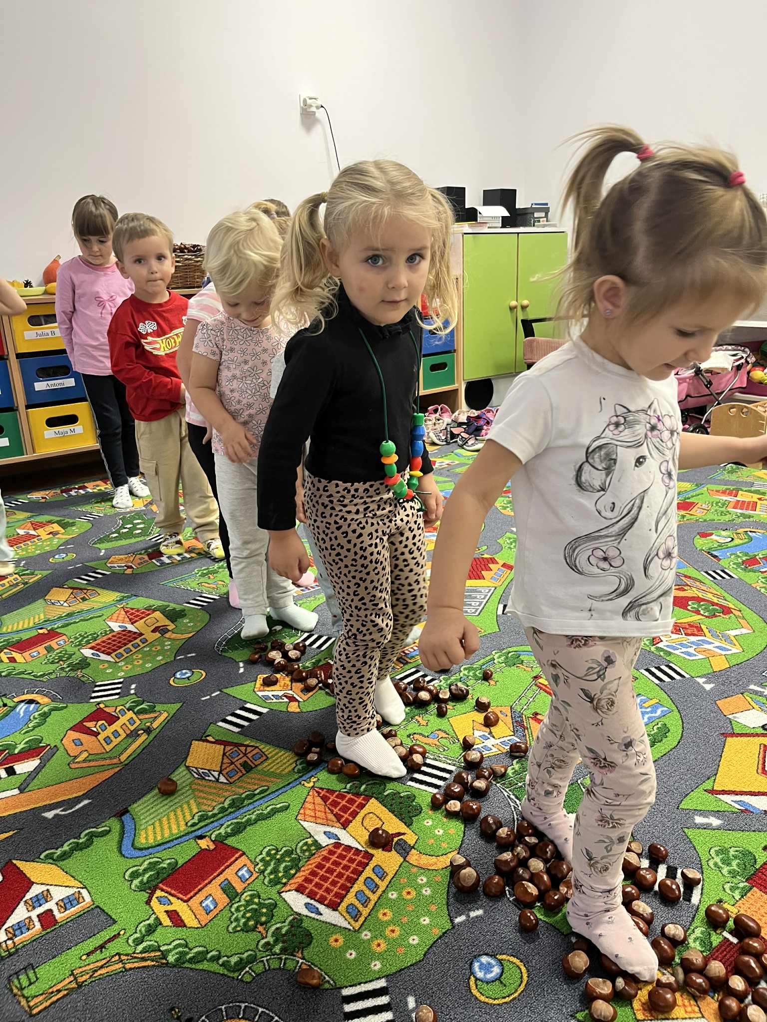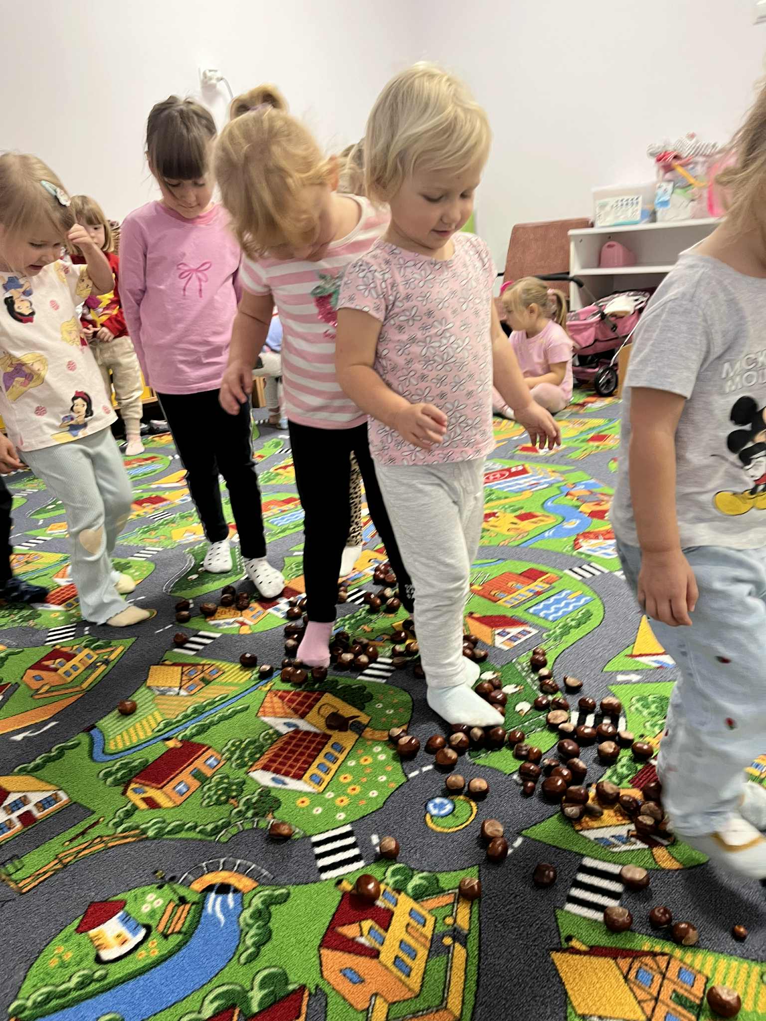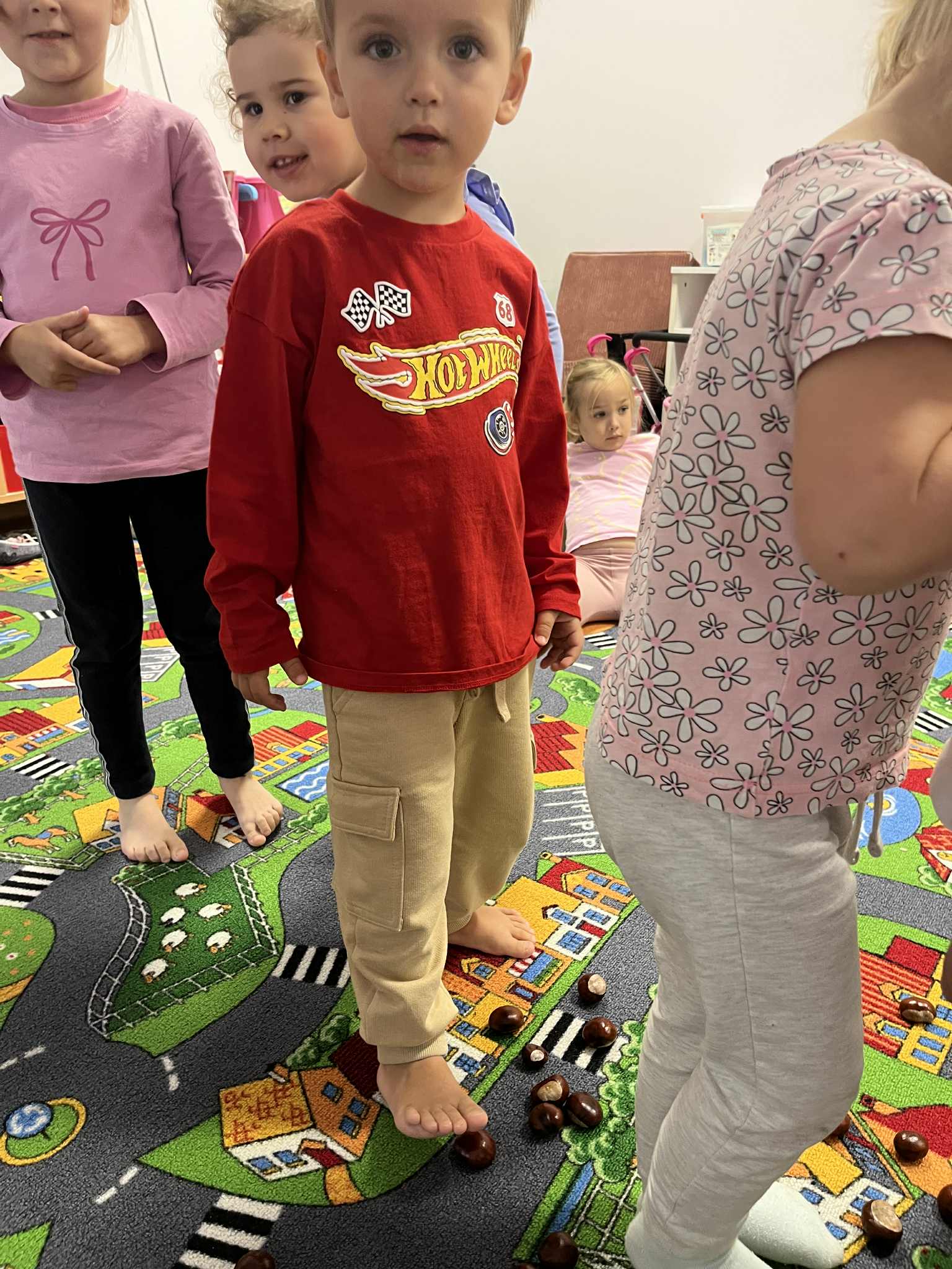 Miniony tydzień w naszym przedszkolu upłynął pod znakiem Złotej Jesieni. Dzieci z wielkim zaangażowaniem przynosiły z domów kasztany, żołędzie i inne skarby natury, które wspólnie wykorzystaliśmy do stworzenia jesiennej drogi sensorycznej. Chodziliśmy po niej w skarpetkach, a najodważniejsi – nawet boso! To była świetna okazja do rozwijania zmysłu dotyku i świetnej zabawy. Podczas zajęć rozmawialiśmy o drzewach i ich owocach, poznając takie gatunki jak: jarzębina, dąb, kasztanowiec oraz ich charakterystyczne owoce – żołędzie, kasztany czy korale jarzębiny. Wybraliśmy się również na spacer, podczas którego podziwialiśmy barwy jesiennych drzew. Udało nam się nawet znaleźć maślaki, które z radością zabraliśmy do przedszkola i wspólnie obejrzeliśmy z bliska. W piątek obchodziliśmy Dzień Drzewa. Z tej okazji dzieci stworzyły piękne, kolorowe prace plastyczne – każde drzewo było inne, wyjątkowe, tak jak nasi mali artyści.