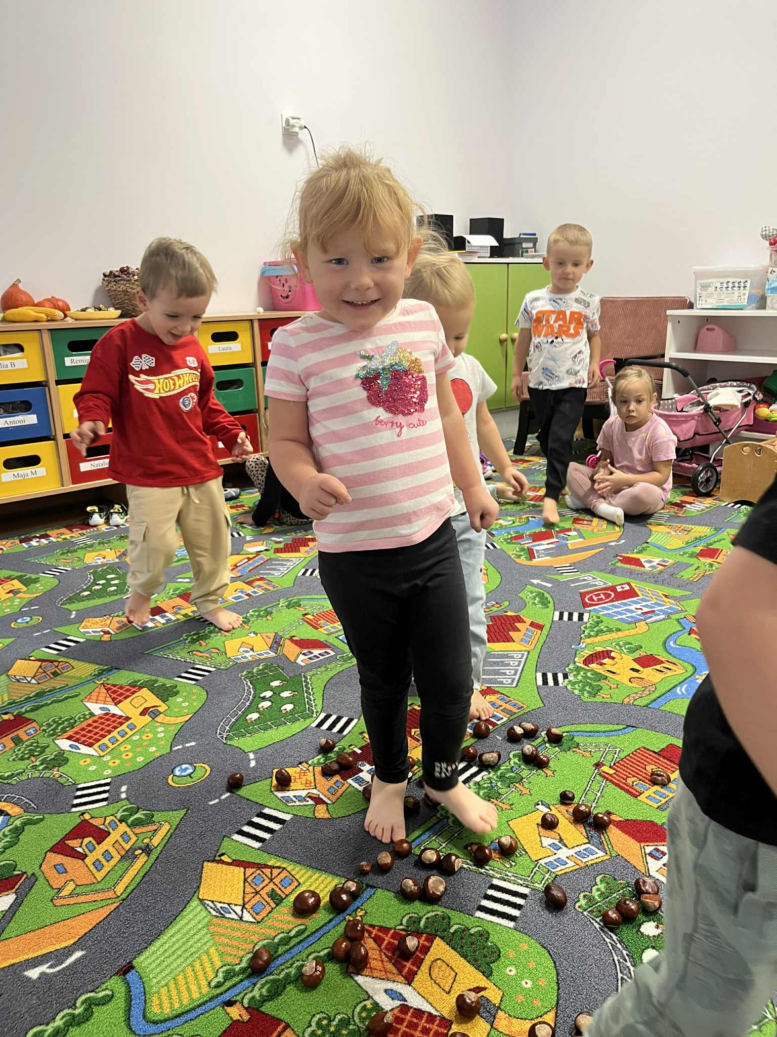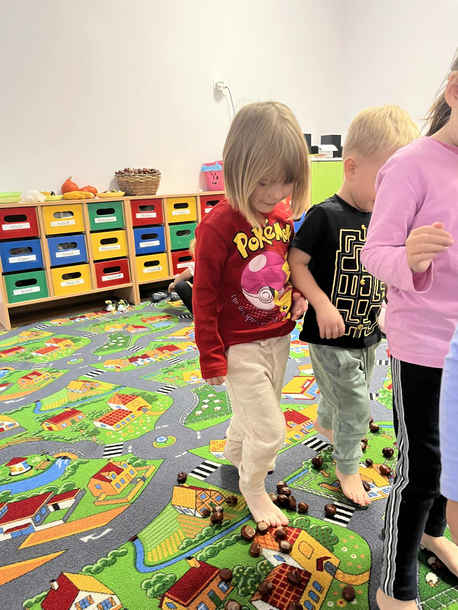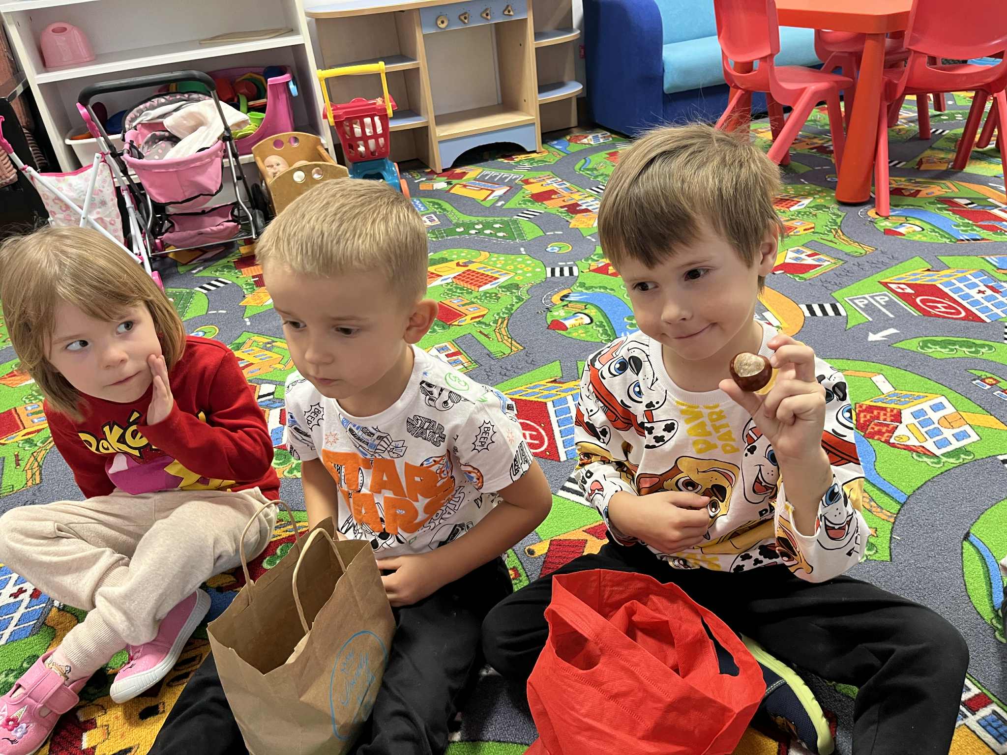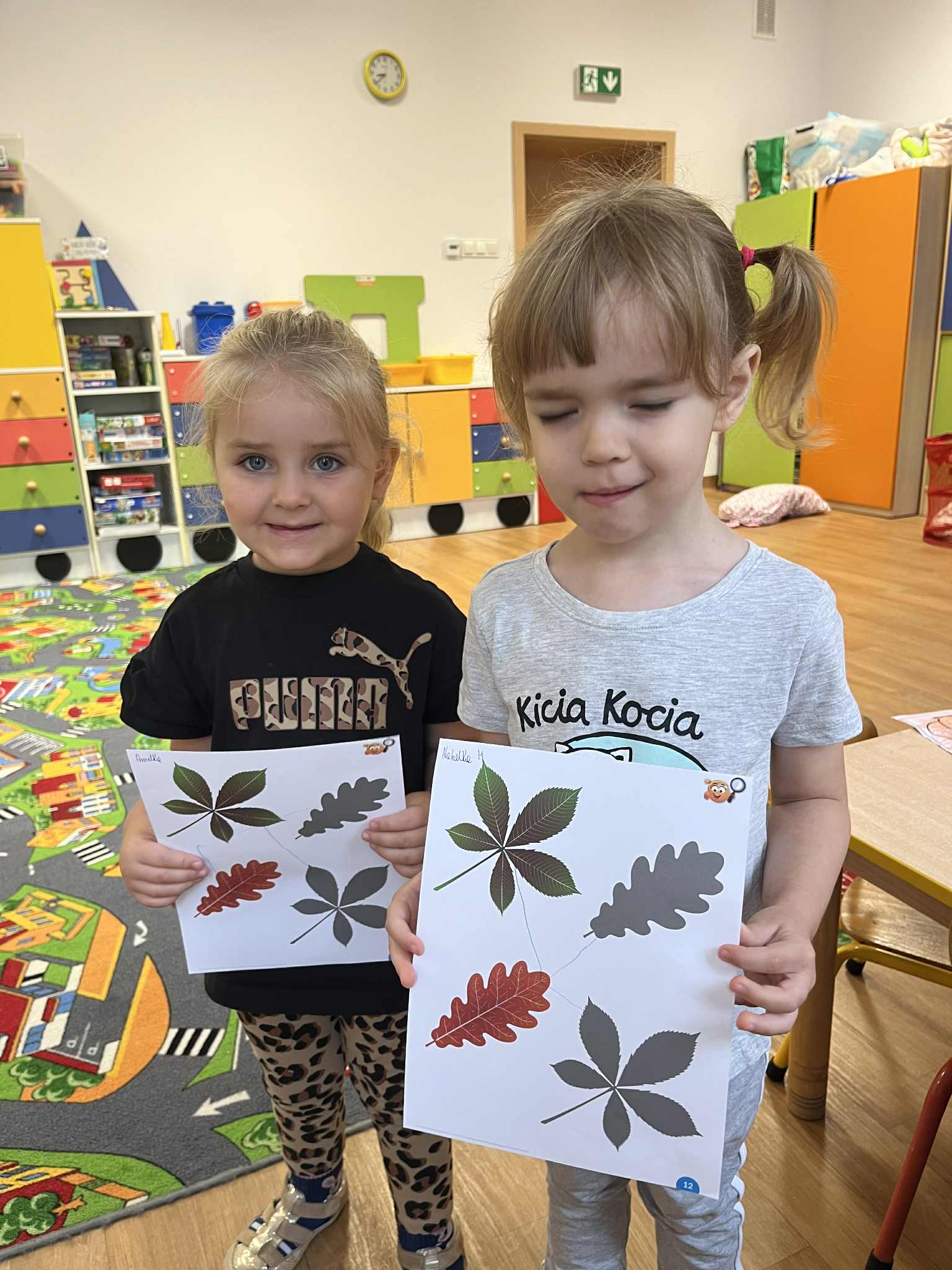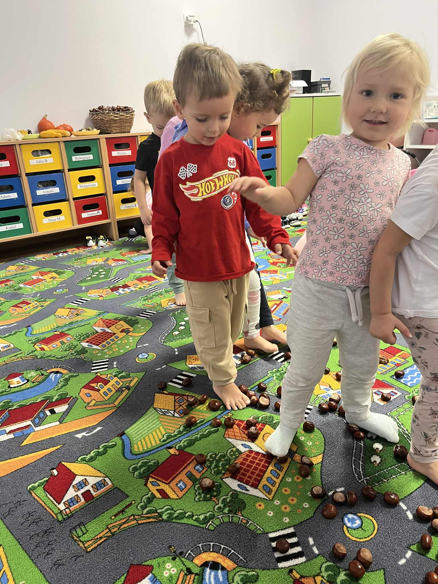 Miniony tydzień w naszym przedszkolu upłynął pod znakiem Złotej Jesieni. Dzieci z wielkim zaangażowaniem przynosiły z domów kasztany, żołędzie i inne skarby natury, które wspólnie wykorzystaliśmy do stworzenia jesiennej drogi sensorycznej. Chodziliśmy po niej w skarpetkach, a najodważniejsi – nawet boso! To była świetna okazja do rozwijania zmysłu dotyku i świetnej zabawy. Podczas zajęć rozmawialiśmy o drzewach i ich owocach, poznając takie gatunki jak: jarzębina, dąb, kasztanowiec oraz ich charakterystyczne owoce – żołędzie, kasztany czy korale jarzębiny. Wybraliśmy się również na spacer, podczas którego podziwialiśmy barwy jesiennych drzew. Udało nam się nawet znaleźć maślaki, które z radością zabraliśmy do przedszkola i wspólnie obejrzeliśmy z bliska. W piątek obchodziliśmy Dzień Drzewa. Z tej okazji dzieci stworzyły piękne, kolorowe prace plastyczne – każde drzewo było inne, wyjątkowe, tak jak nasi mali artyści.