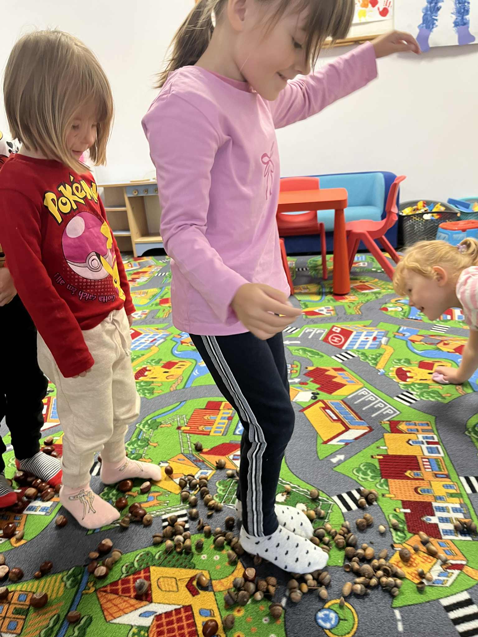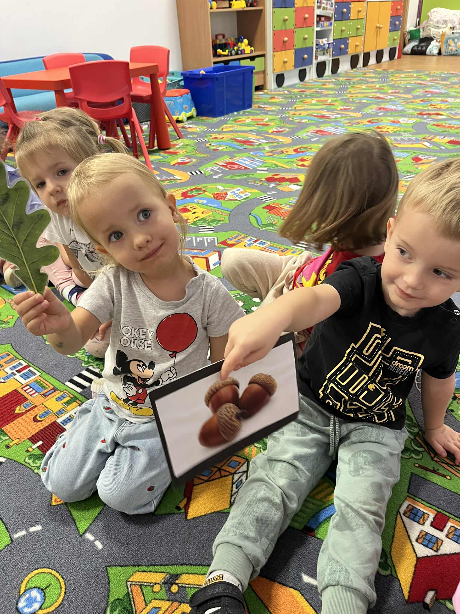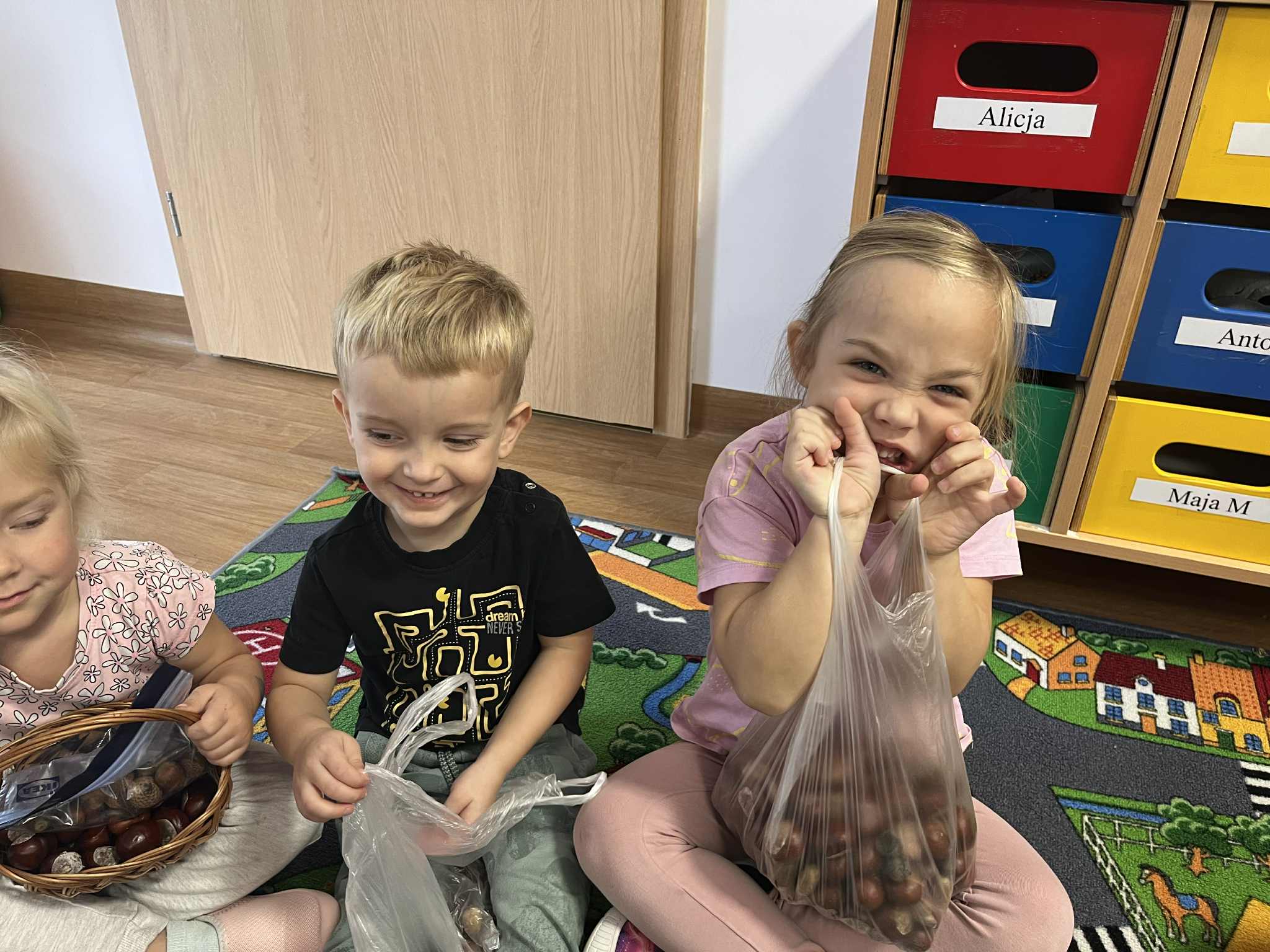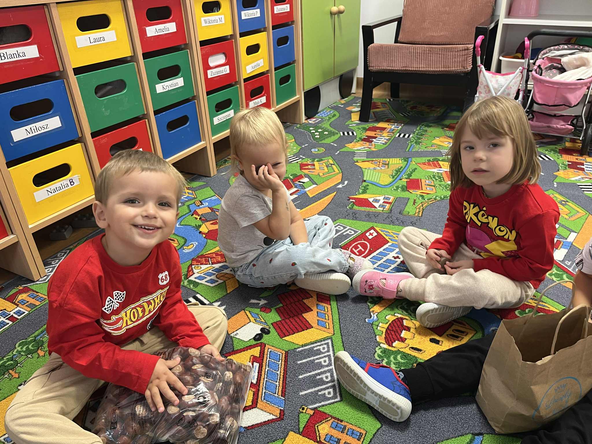 Miniony tydzień w naszym przedszkolu upłynął pod znakiem Złotej Jesieni. Dzieci z wielkim zaangażowaniem przynosiły z domów kasztany, żołędzie i inne skarby natury, które wspólnie wykorzystaliśmy do stworzenia jesiennej drogi sensorycznej. Chodziliśmy po niej w skarpetkach, a najodważniejsi – nawet boso! To była świetna okazja do rozwijania zmysłu dotyku i świetnej zabawy. Podczas zajęć rozmawialiśmy o drzewach i ich owocach, poznając takie gatunki jak: jarzębina, dąb, kasztanowiec oraz ich charakterystyczne owoce – żołędzie, kasztany czy korale jarzębiny. Wybraliśmy się również na spacer, podczas którego podziwialiśmy barwy jesiennych drzew. Udało nam się nawet znaleźć maślaki, które z radością zabraliśmy do przedszkola i wspólnie obejrzeliśmy z bliska. W piątek obchodziliśmy Dzień Drzewa. Z tej okazji dzieci stworzyły piękne, kolorowe prace plastyczne – każde drzewo było inne, wyjątkowe, tak jak nasi mali artyści.