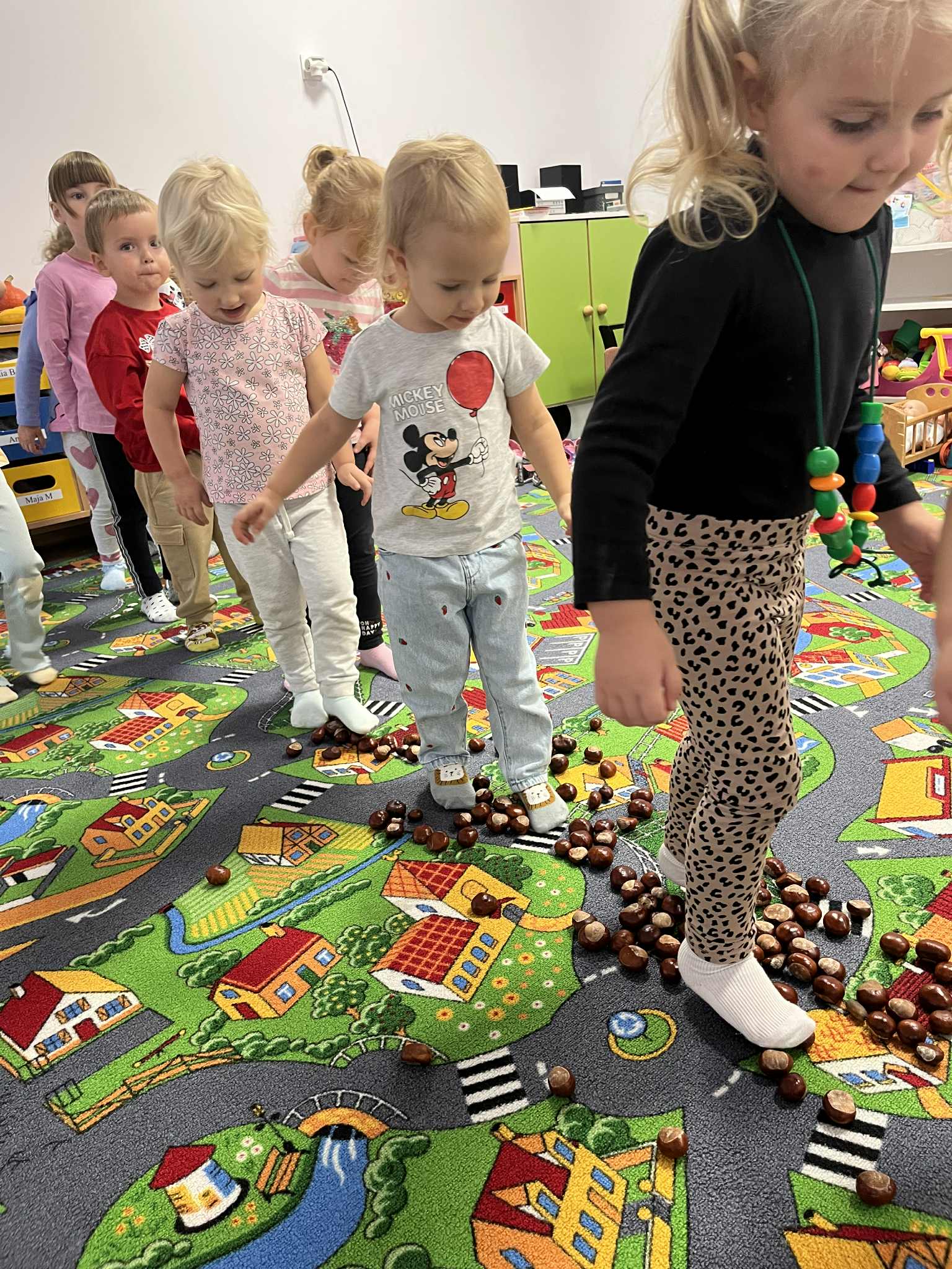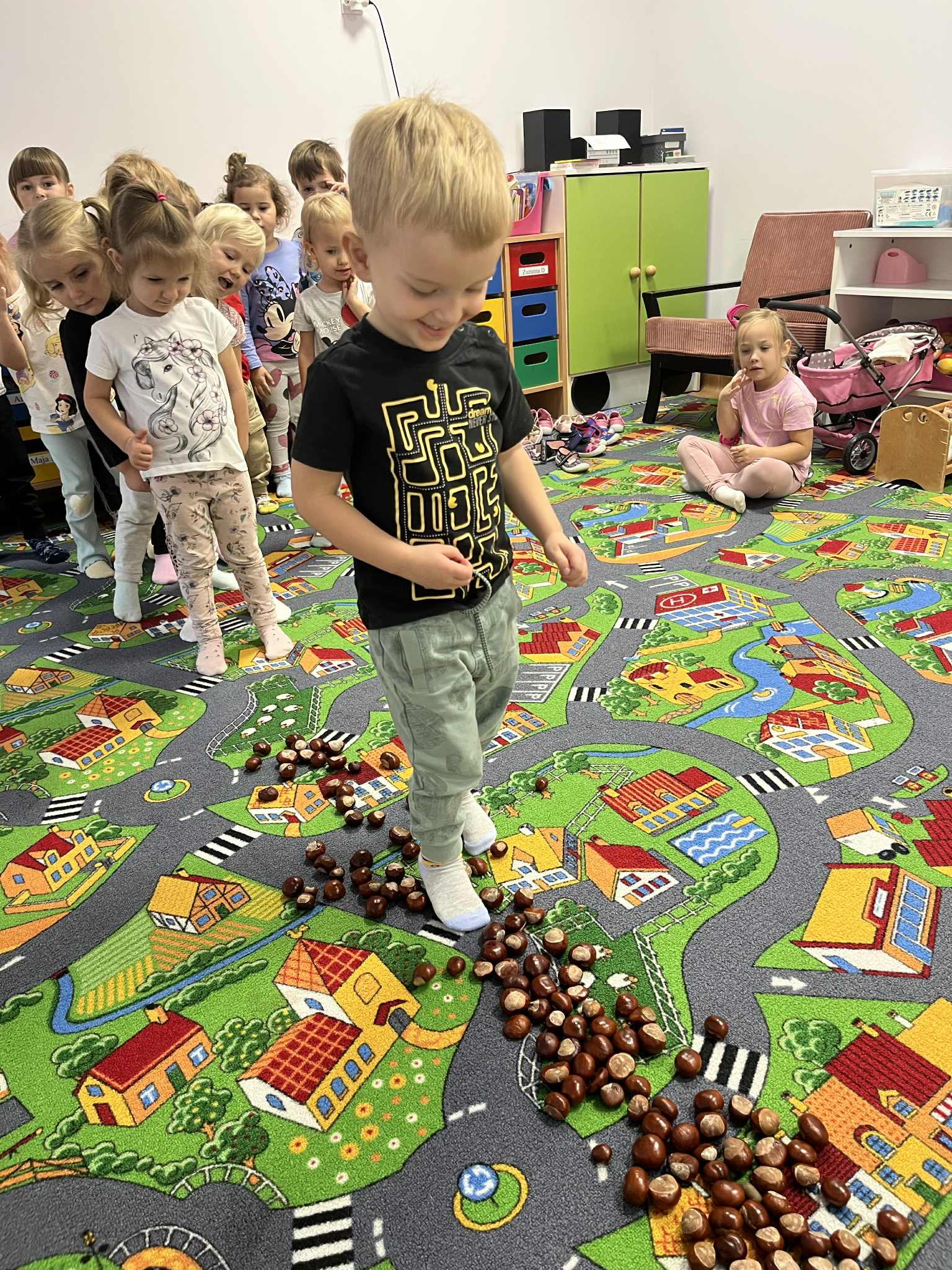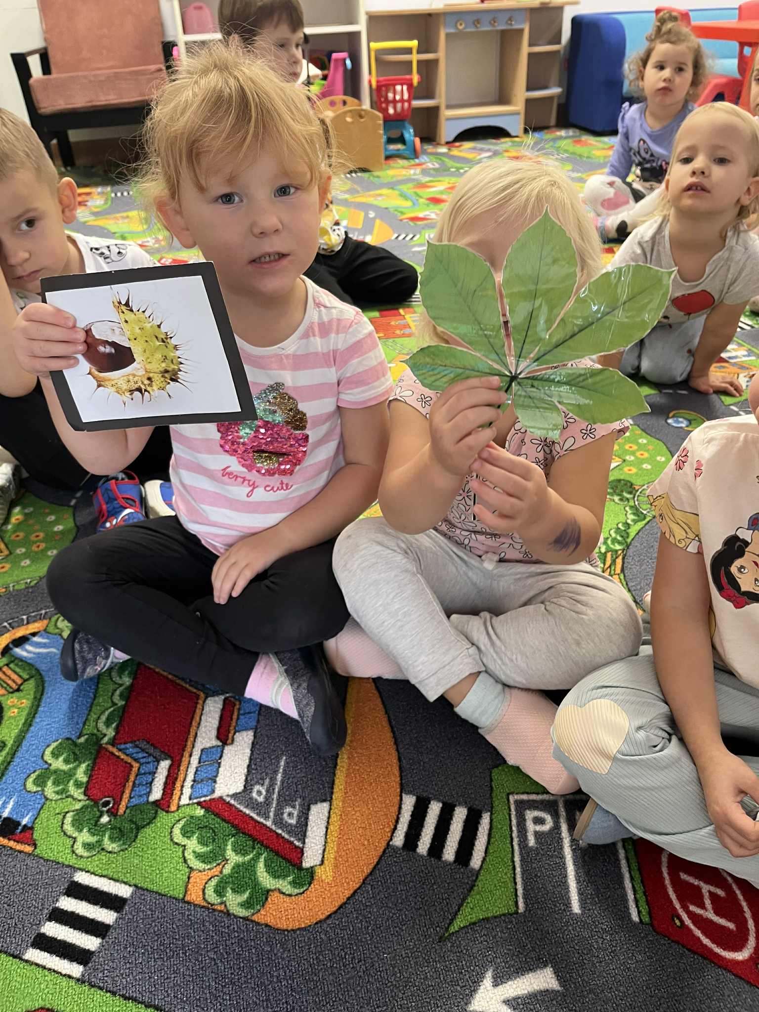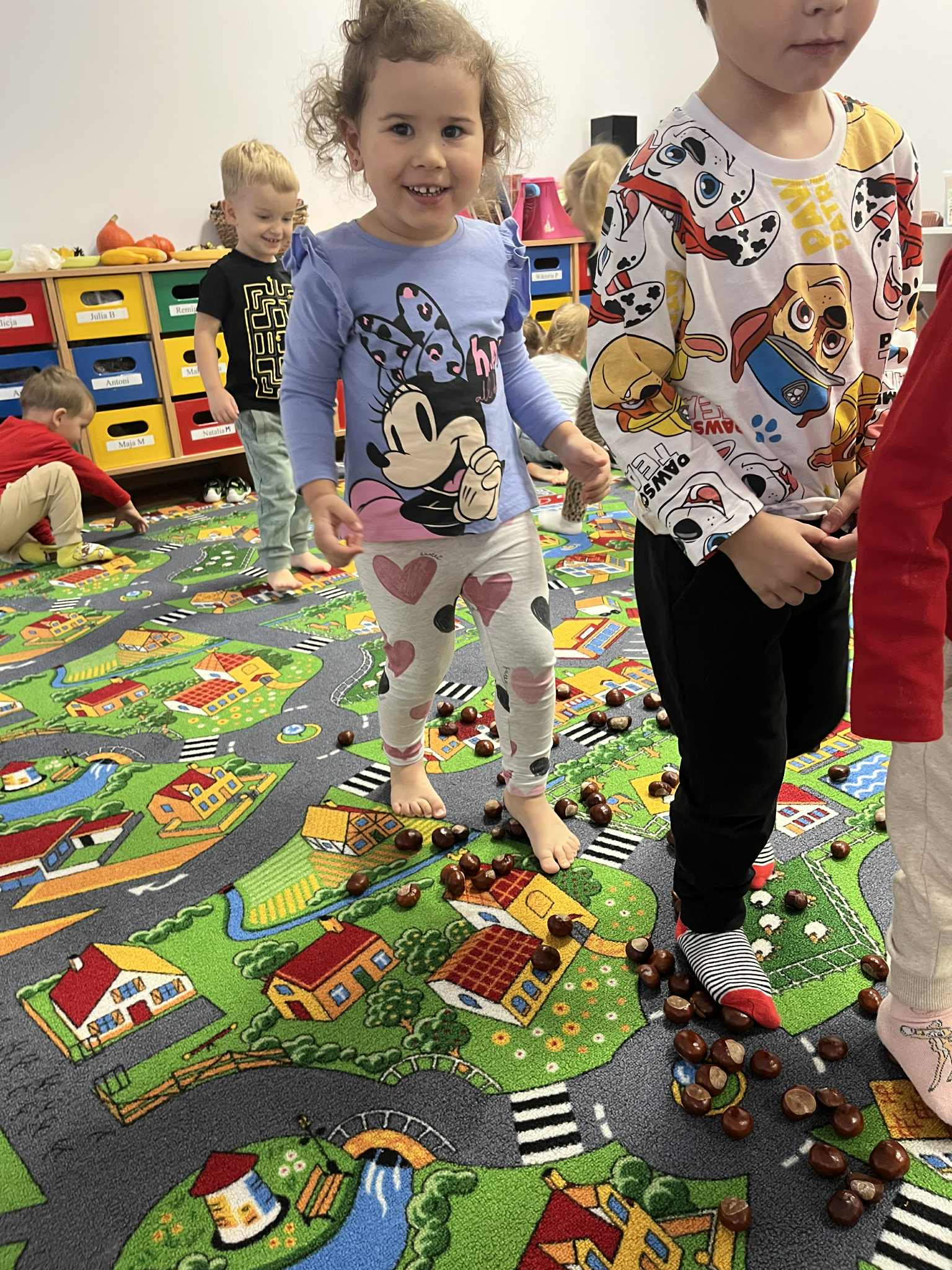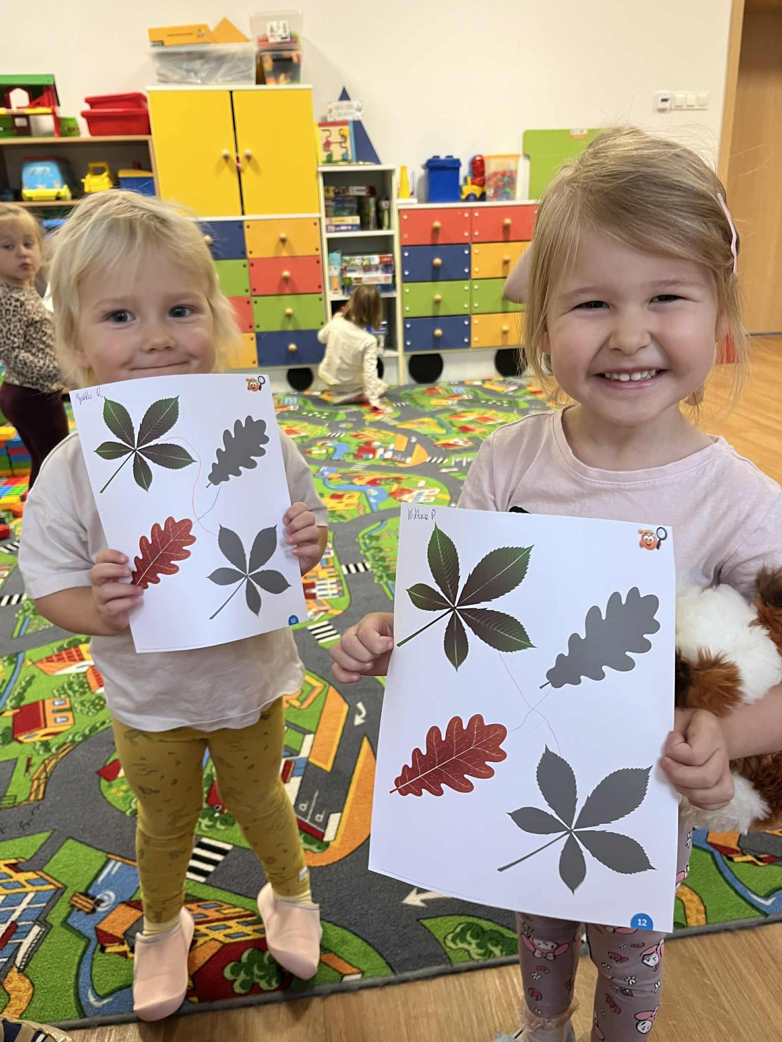 Miniony tydzień w naszym przedszkolu upłynął pod znakiem Złotej Jesieni. Dzieci z wielkim zaangażowaniem przynosiły z domów kasztany, żołędzie i inne skarby natury, które wspólnie wykorzystaliśmy do stworzenia jesiennej drogi sensorycznej. Chodziliśmy po niej w skarpetkach, a najodważniejsi – nawet boso! To była świetna okazja do rozwijania zmysłu dotyku i świetnej zabawy. Podczas zajęć rozmawialiśmy o drzewach i ich owocach, poznając takie gatunki jak: jarzębina, dąb, kasztanowiec oraz ich charakterystyczne owoce – żołędzie, kasztany czy korale jarzębiny. Wybraliśmy się również na spacer, podczas którego podziwialiśmy barwy jesiennych drzew. Udało nam się nawet znaleźć maślaki, które z radością zabraliśmy do przedszkola i wspólnie obejrzeliśmy z bliska. W piątek obchodziliśmy Dzień Drzewa. Z tej okazji dzieci stworzyły piękne, kolorowe prace plastyczne – każde drzewo było inne, wyjątkowe, tak jak nasi mali artyści.