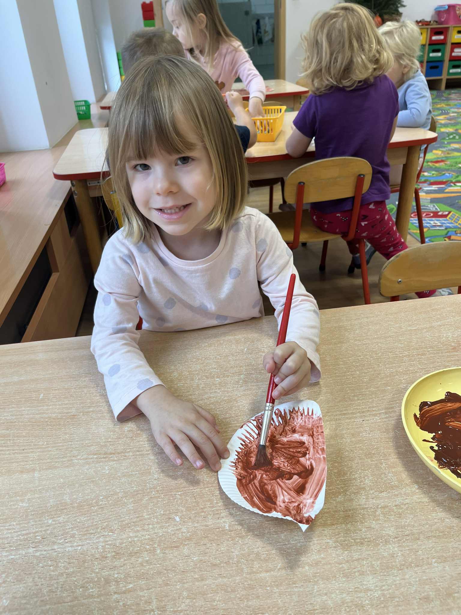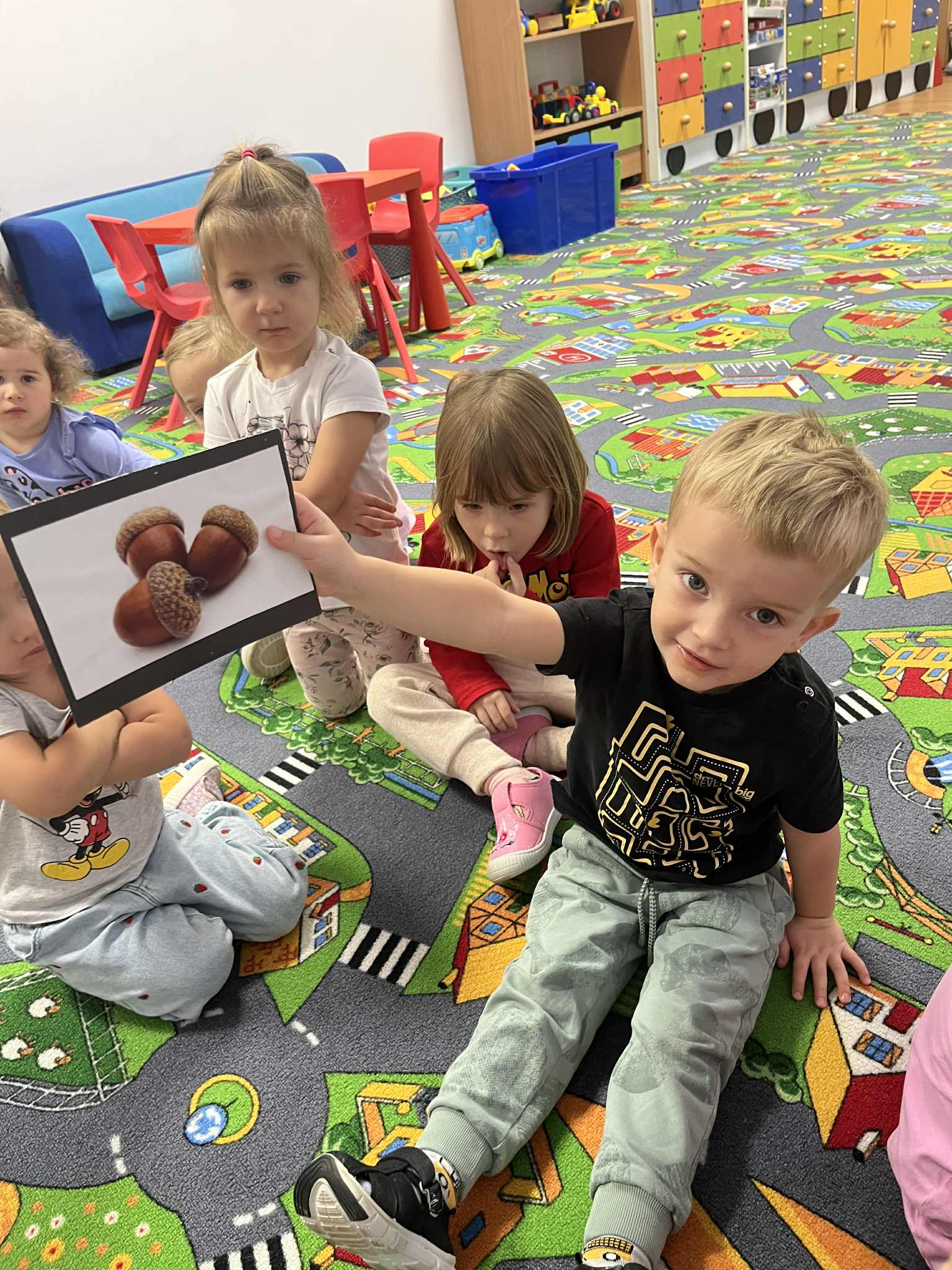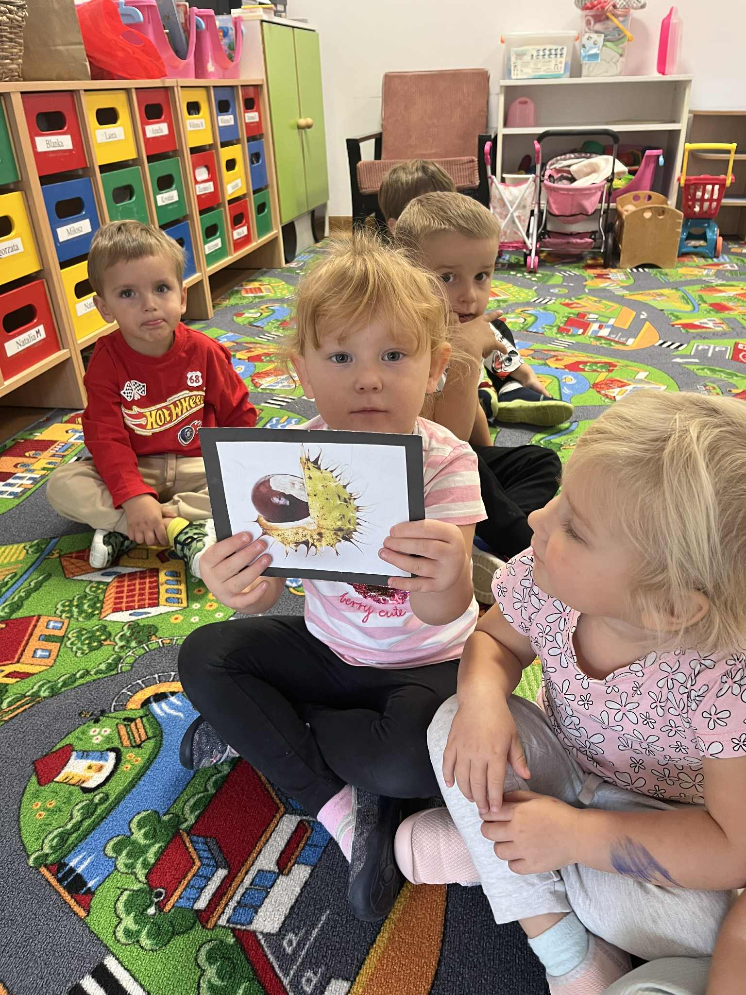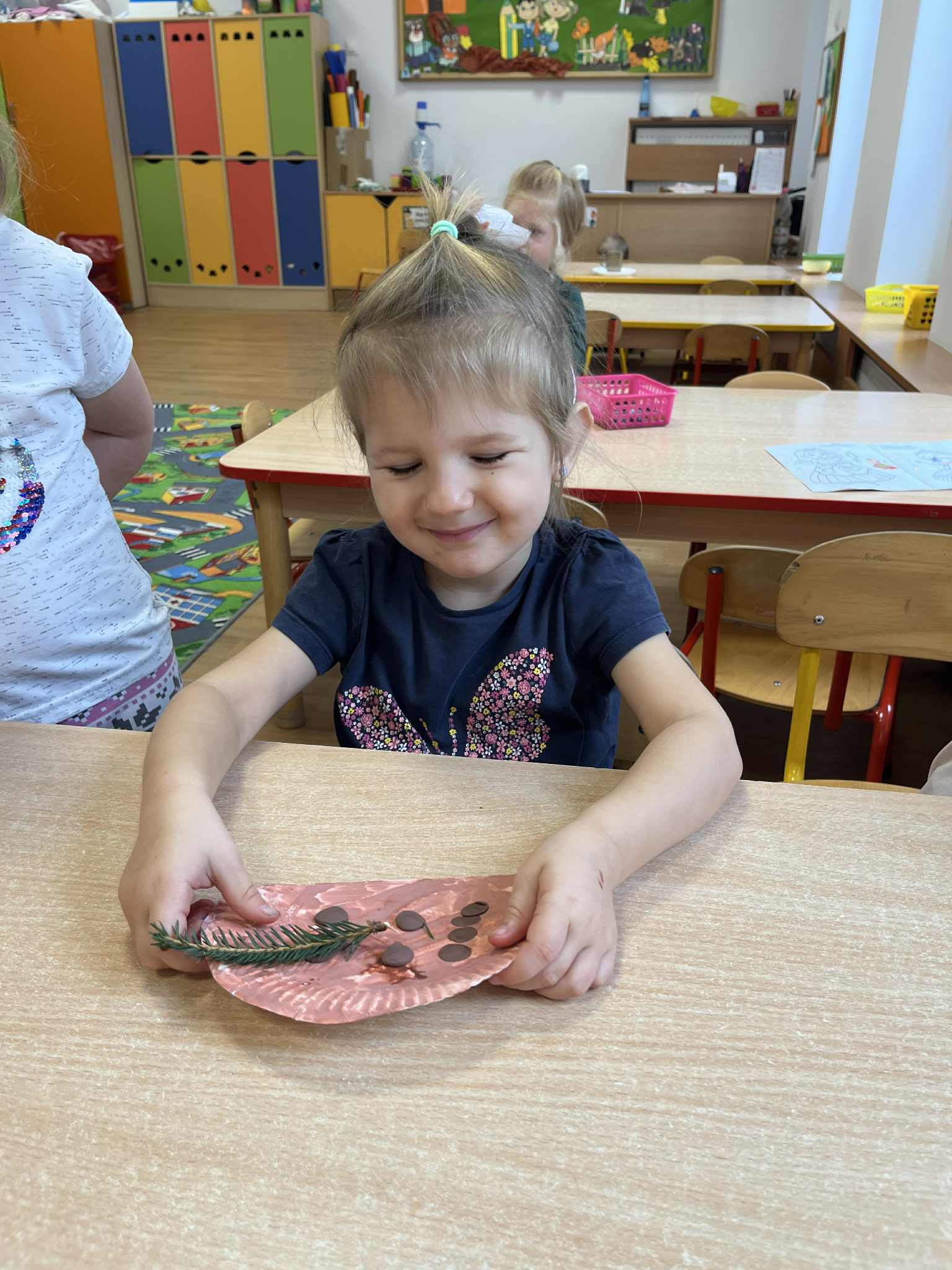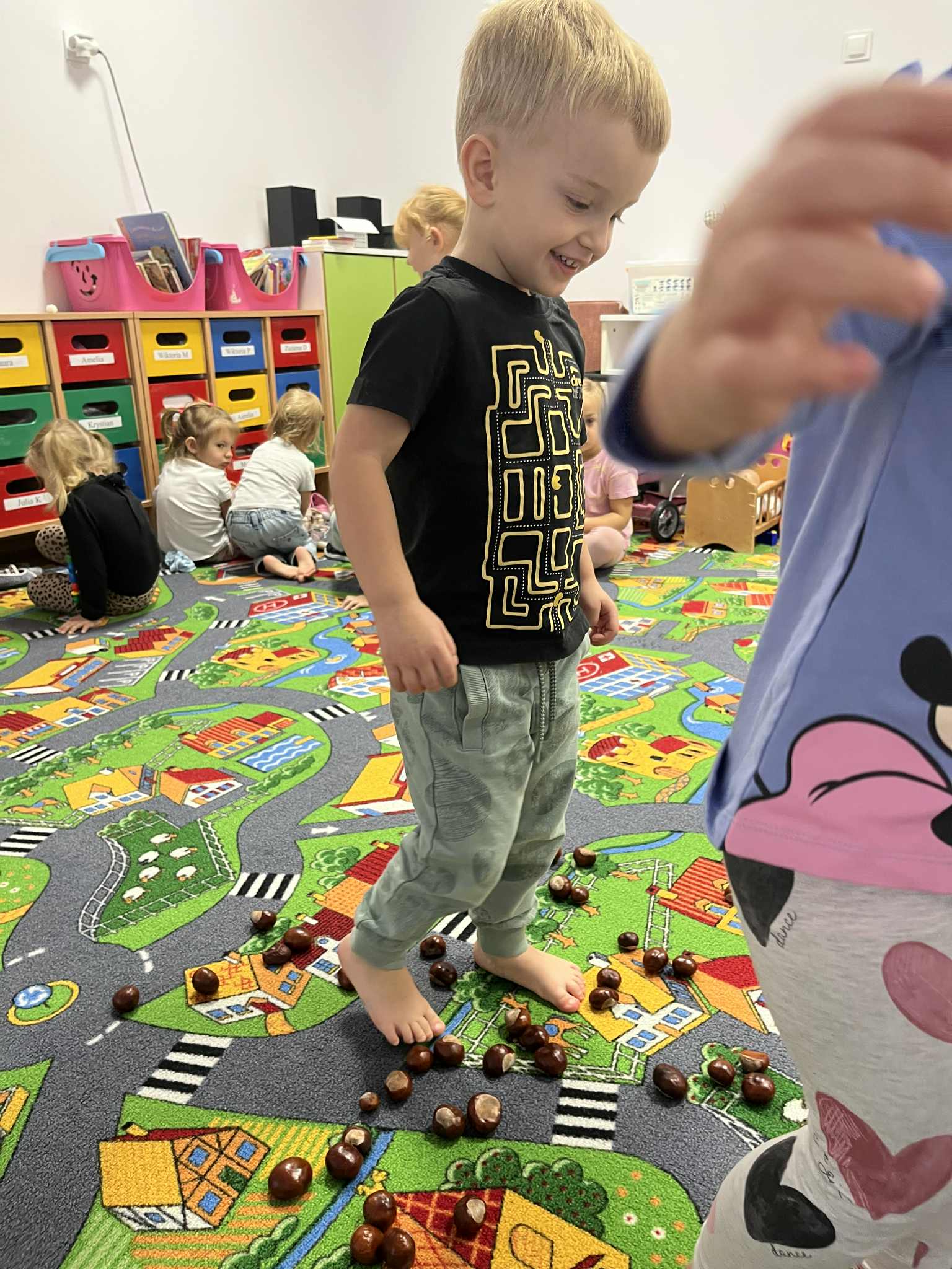 Miniony tydzień w naszym przedszkolu upłynął pod znakiem Złotej Jesieni. Dzieci z wielkim zaangażowaniem przynosiły z domów kasztany, żołędzie i inne skarby natury, które wspólnie wykorzystaliśmy do stworzenia jesiennej drogi sensorycznej. Chodziliśmy po niej w skarpetkach, a najodważniejsi – nawet boso! To była świetna okazja do rozwijania zmysłu dotyku i świetnej zabawy. Podczas zajęć rozmawialiśmy o drzewach i ich owocach, poznając takie gatunki jak: jarzębina, dąb, kasztanowiec oraz ich charakterystyczne owoce – żołędzie, kasztany czy korale jarzębiny. Wybraliśmy się również na spacer, podczas którego podziwialiśmy barwy jesiennych drzew. Udało nam się nawet znaleźć maślaki, które z radością zabraliśmy do przedszkola i wspólnie obejrzeliśmy z bliska. W piątek obchodziliśmy Dzień Drzewa. Z tej okazji dzieci stworzyły piękne, kolorowe prace plastyczne – każde drzewo było inne, wyjątkowe, tak jak nasi mali artyści.